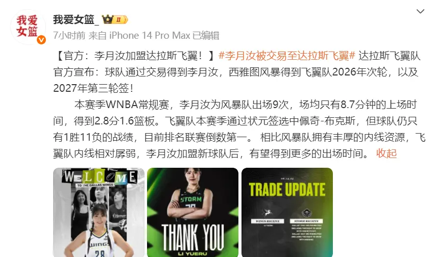本赛季,李月汝代表风暴队出战过9场比赛,场均只有8.7分钟的登场时间,场均只有2.8分1.6板。相比于上赛季在洛杉矶火花队效力,李月汝本赛季的登场时间和数据都大幅度缩水。很显然,李月汝团队对于风暴队非常不满意,而双方在经过十几天的商讨后,风暴队最终决定将李月汝送至达拉斯飞翼队。从他们那里换来了两个选秀权,分别是2026年的次轮签,以及2027年的第三轮签。